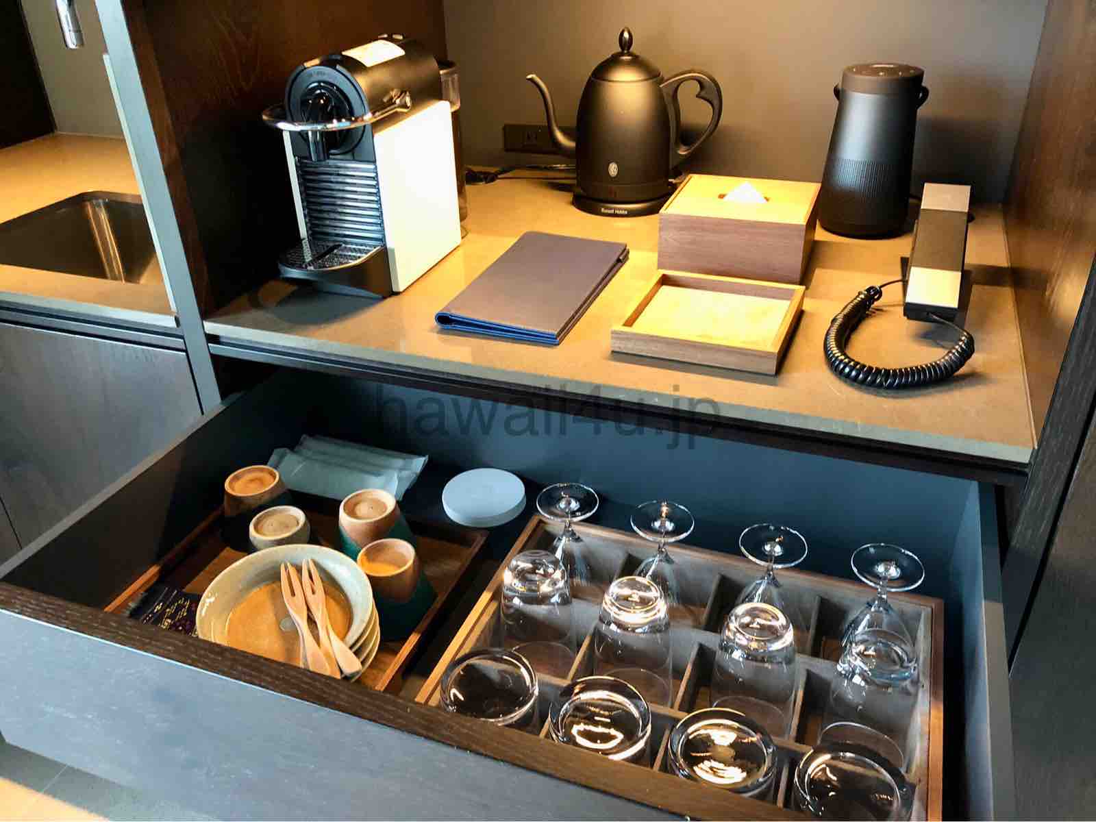 グラスの種類も豊富。お皿もあるのでお部屋の中での食事するのに良いですね